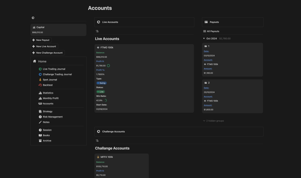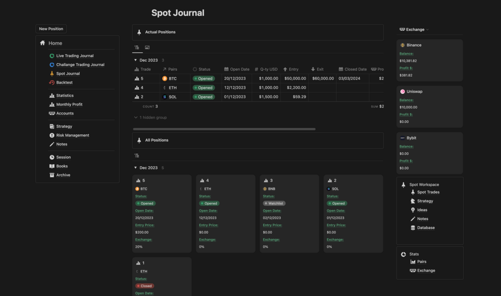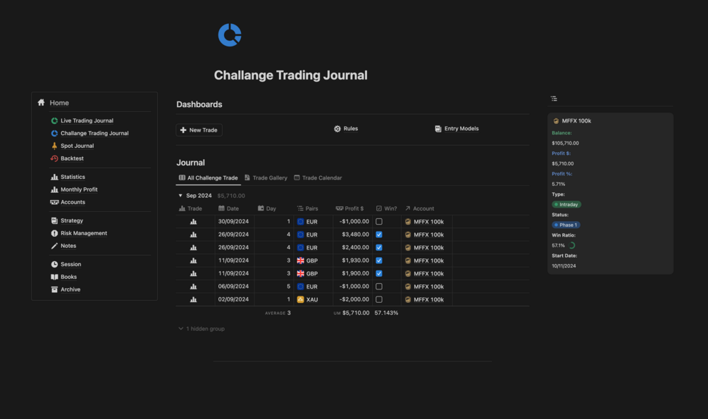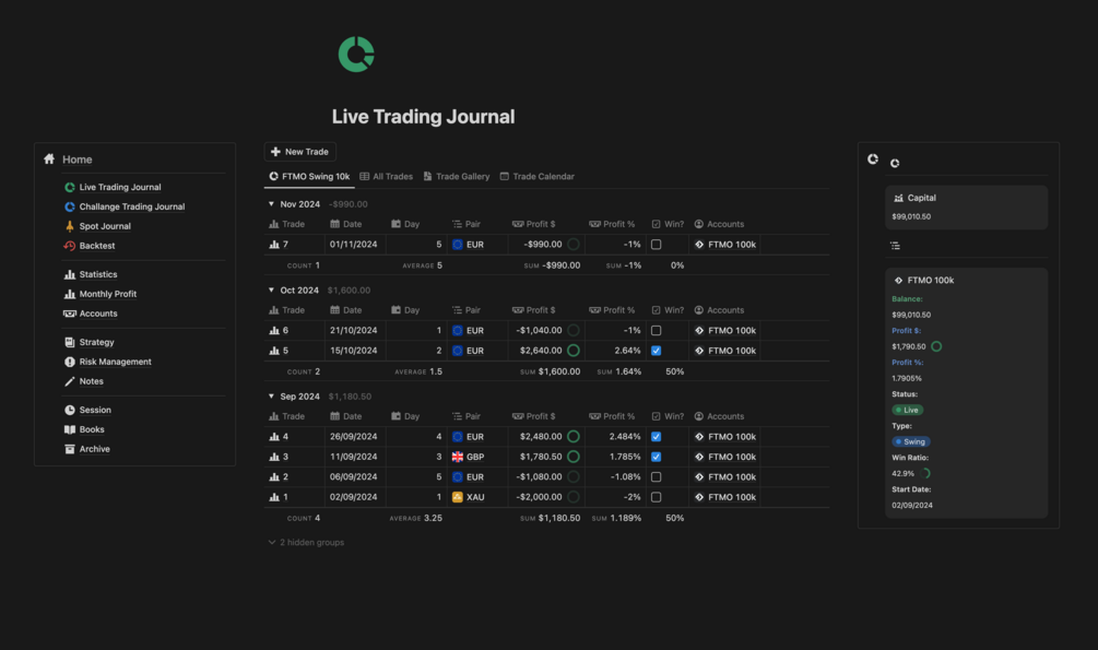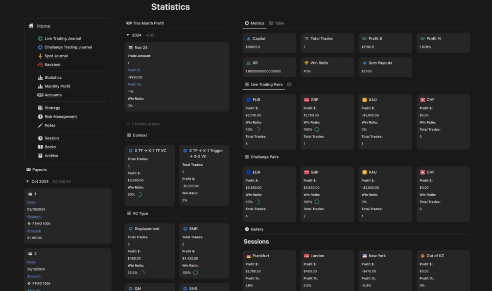 This trading workspace helps you reach new heights in trading with its user-friendly interface and powerful tools for collecting and analyzing statistics. All the data you input is automatically displayed in clear charts, allowing you to instantly assess results and make more informed decisions.
